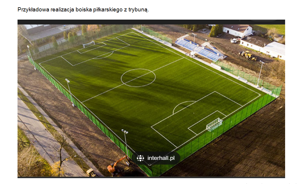 - Pełnowymiarowego boiska do piłki nożnej o nawierzchni z trawy syntetycznej – całkowita powierzchnia 75m.x115m (wraz ze strefami bezpiecznymi),