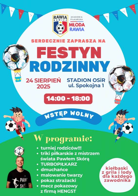 Na stadionie OSiR przy ul. Spokojnej czeka na Was moc atrakcji z turniejem rodziców oraz pokazem sztuczek piłkarskich w wykonaniu Pawła Skóry na czele!
